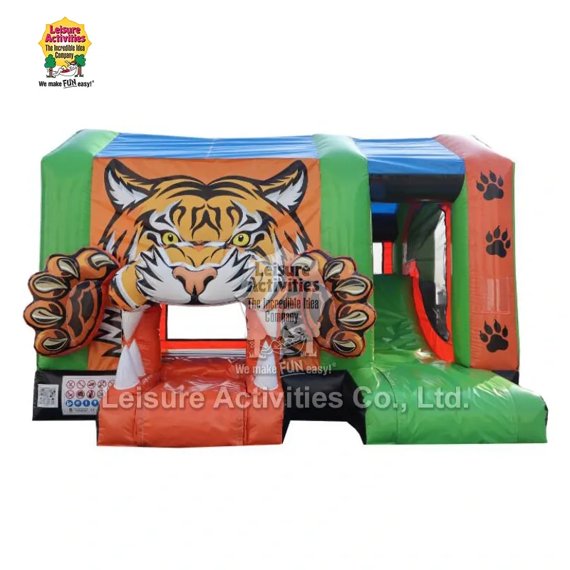 Leisure Activities® je profesionalni proizvajalec in dobavitelj napihljivih izdelkov na Kitajskem. Standard Inflatable Multiplay Tiger Bouncy Castles je napihljiv grad na temo tigra, ki združuje funkcije skakanja, plezanja in drsenja. Glavni barvi sta zelena in oranžna, s 3D dekoracijo tigra na vhodu. Lahko se hitro postavi v samo 10 minutah.